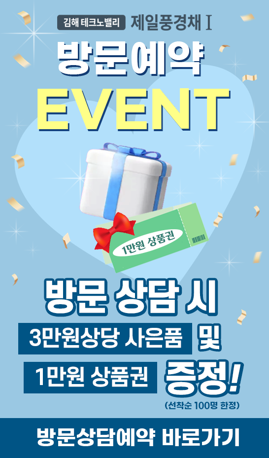 김해 테크노밸리 제일풍경채 방문예약 고객의 개인정보를 수집합니다. 수집한 개인정보는 방문예약 이외의 목적으로는 사용하지 않으며, 모집 기간 완료 후 즉시 파기합니다. 개인정보의 수집 및 이용에 대한 동의를 거부할 수 있으며, 이 경우 방문예약 접수가 어려울 수 있습니다.